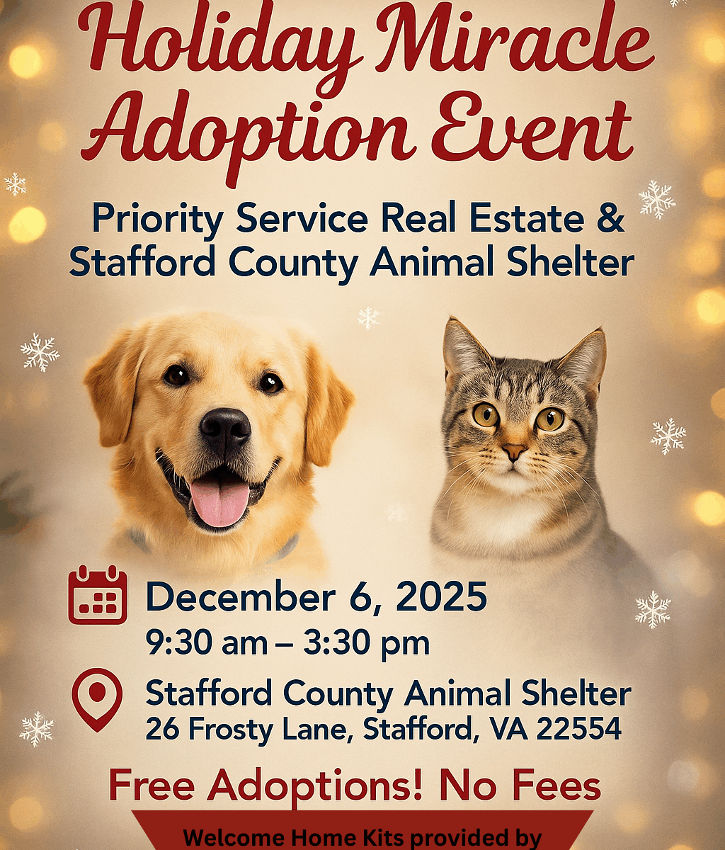 Priority Service Real Estate is teaming up with the Stafford County Animal Shelter to hold a Free Pet Adoption Event. Priority Service Real Estate will be paying the adoption fees for adopted pets.